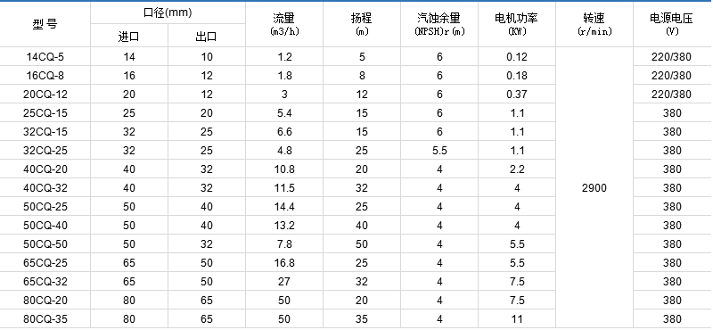 CQ型磁力泵性能參數(shù)